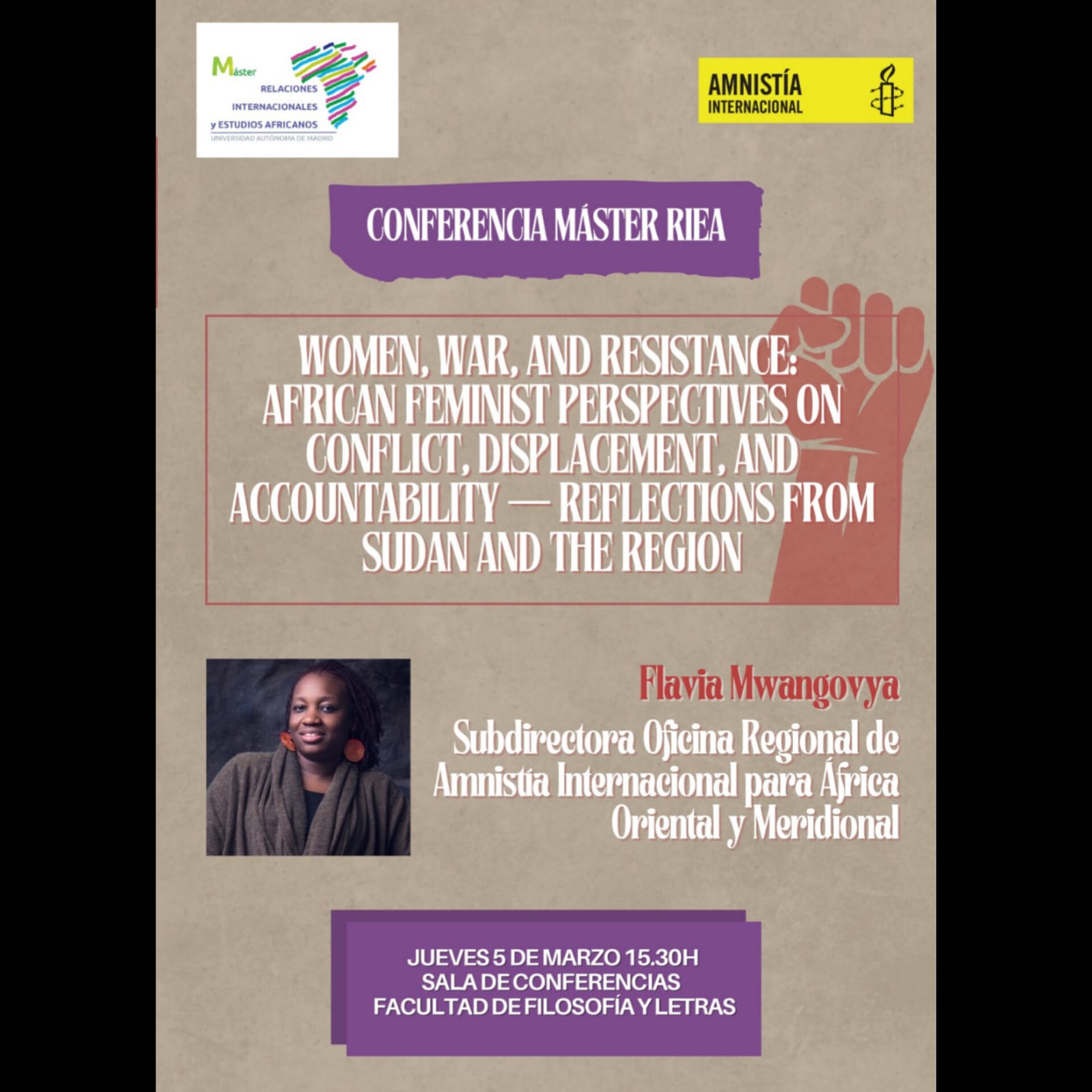 La conferencia será impartida por Flavia Mwangovya, subdirectora de la Oficina Regional de Amnistía Internacional para África Oriental y Meridional, referente internacional en justicia de género y análisis de contextos de crisis.